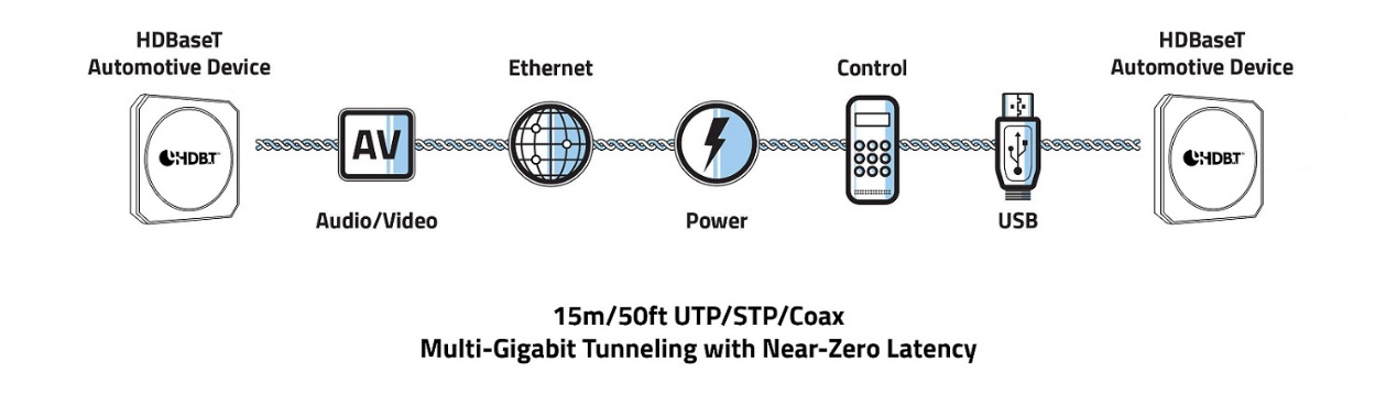HDBaseT Automotive combines the best of existing technologies in one, simple solution for in-vehicle connectivity. HDBaseT is the only technology today that enables Multi-Gigabit tunneling of video & data, with native networking capabilities over 15m (50ft) of a single unshielded twisted-pair (UTP) cable.