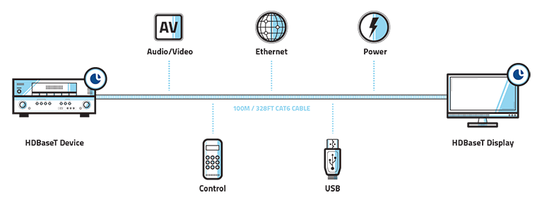 HDBaseT has revolutionized the audiovisual market by offering more features, increased reach, and better performance than existing solutions. The cornerstone of the technology is the 5Play feature set, the converged delivery of uncompressed ultra-high-definition digital video and audio, Ethernet, control signals, USB 2.0, and up to 100W of power through a single, 100m/328ft LAN cable.