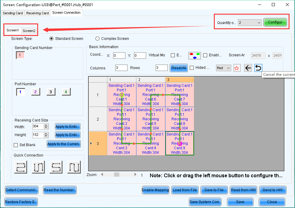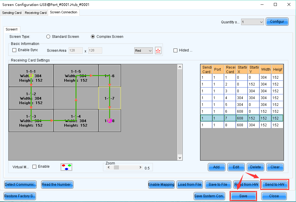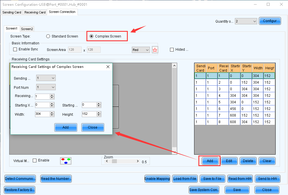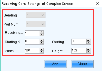 Select 【Complex Screen】, set corresponding sending card, port, pixels managed by each receiving card and origin coordinates (x,y).