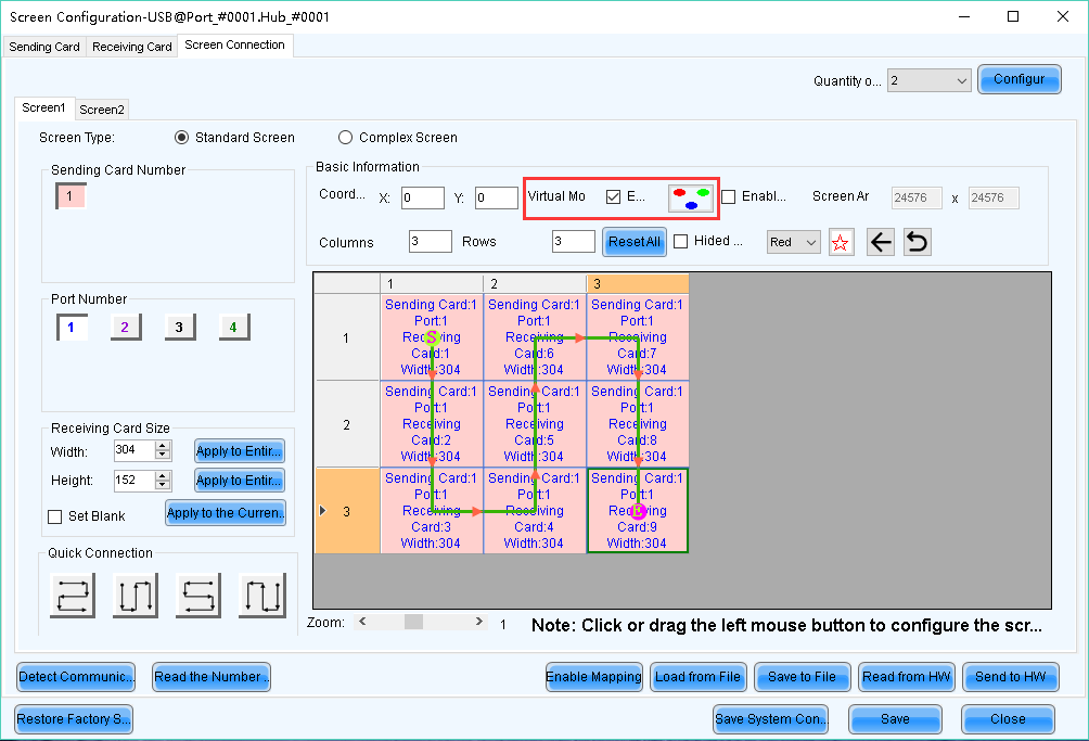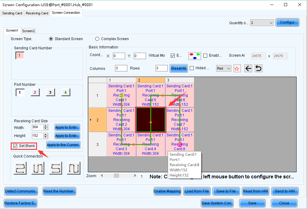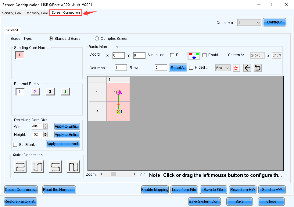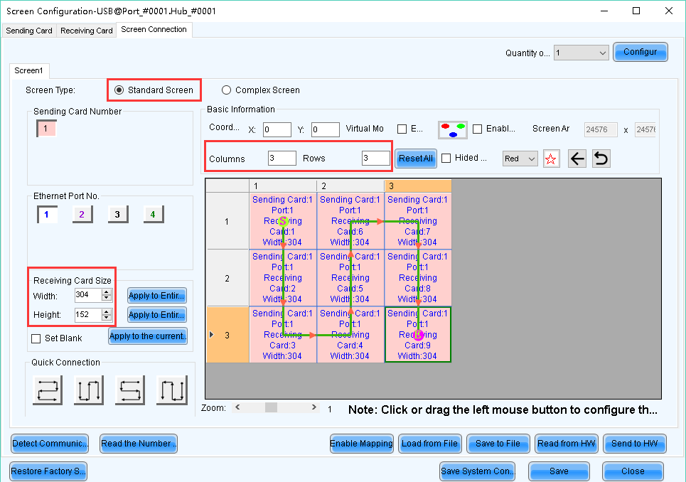 4.1 Select 【Standard Screen】, set how many Scan Boards (Receiving cards) are used in Column and Row, how many pixels one Scan Board (Receiving card) manages in Width and Height, and connect Scan Boards (Receiving cards) based on fact.